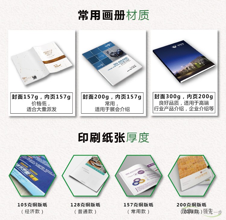 畫冊(cè) 宣傳冊(cè)印刷較常見到的材質(zhì)基本上是銅版紙印刷而成的,銅版紙根據(jù)厚薄不同又分為:105g,128g,157g,200g,250g,300g,350G。但大部分企業(yè)宣傳畫冊(cè)會(huì)采用200g或250G銅版紙做封面,內(nèi)頁采用157G的銅版紙,這種材質(zhì)的較容易印刷而且價(jià)格較為低廉。還有采用封面為特種紙,內(nèi)頁銅版紙的材料,也有全部采用特種紙印刷的畫冊(cè)。有的企業(yè)為節(jié)約成本,也有用157G銅版紙為封面,128G為內(nèi)頁材質(zhì)的。畫冊(cè)印刷 畫冊(cè)設(shè)計(jì)印刷怎樣才能節(jié)約成本呢?最主要要根據(jù)企業(yè)的情況,由企業(yè)自己來選擇,同等數(shù)量,同等頁面,同樣工藝等,材質(zhì)越薄價(jià)格越低。